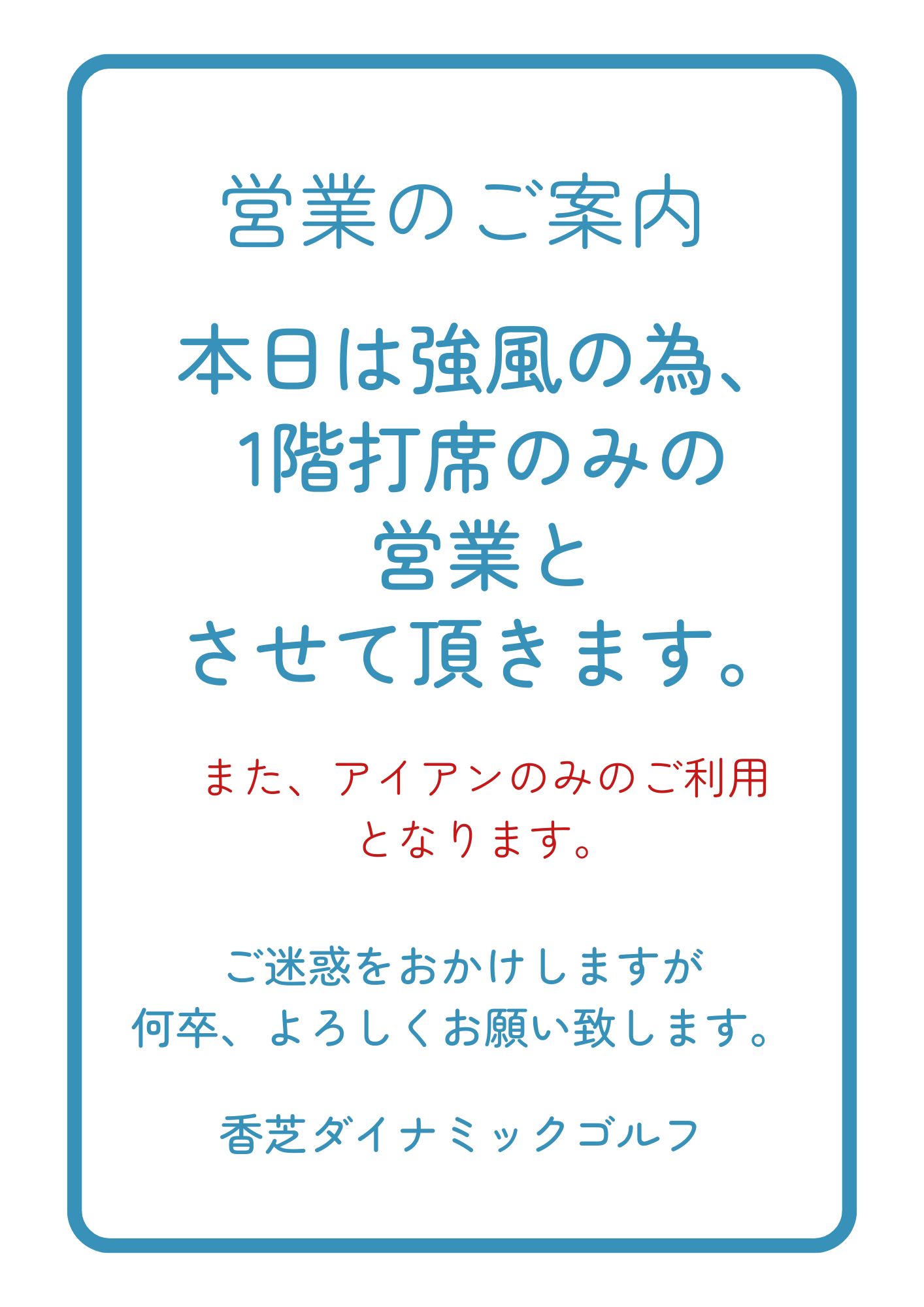本日、強風の為1階打席のみの営業となっております。
